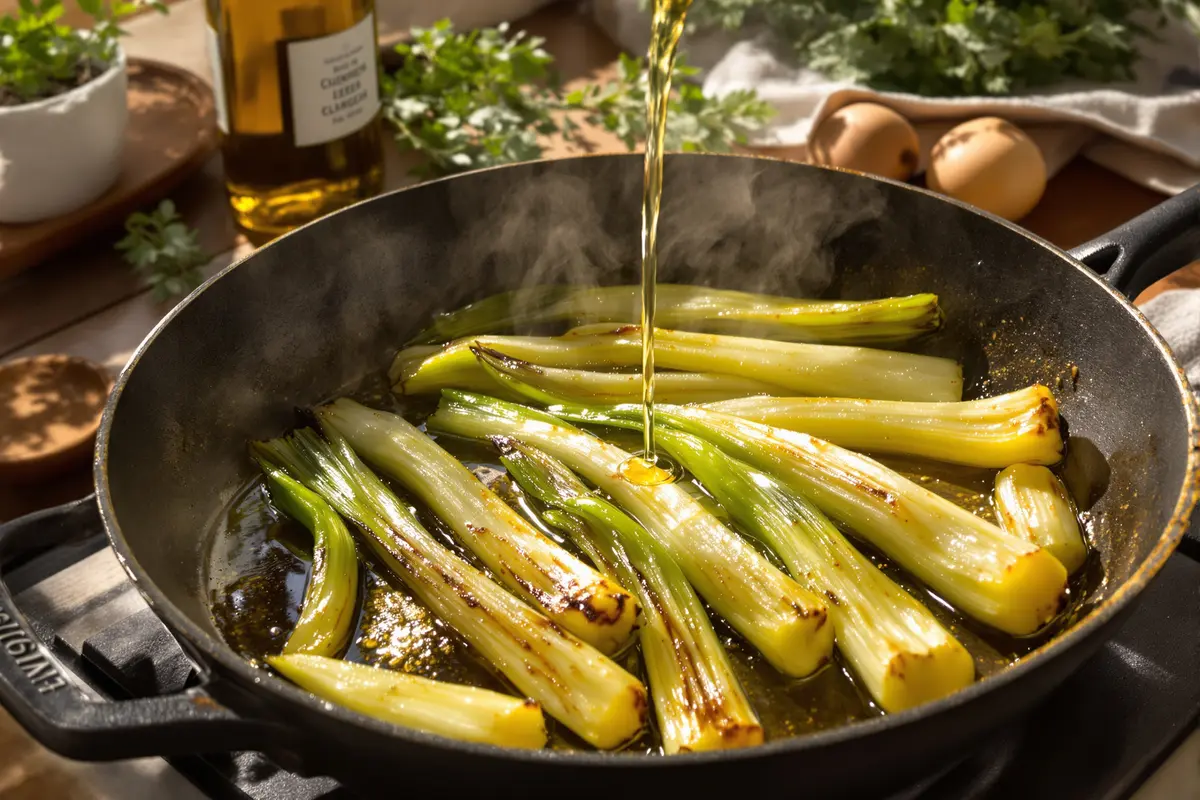 La technique du chef, aussi rapide qu’efficace, change tout. Grâce à la poêle bien chaude, un peu d’huile et un coup de vinaigre, le poireau devient noble, raffiné, presque étonnant.