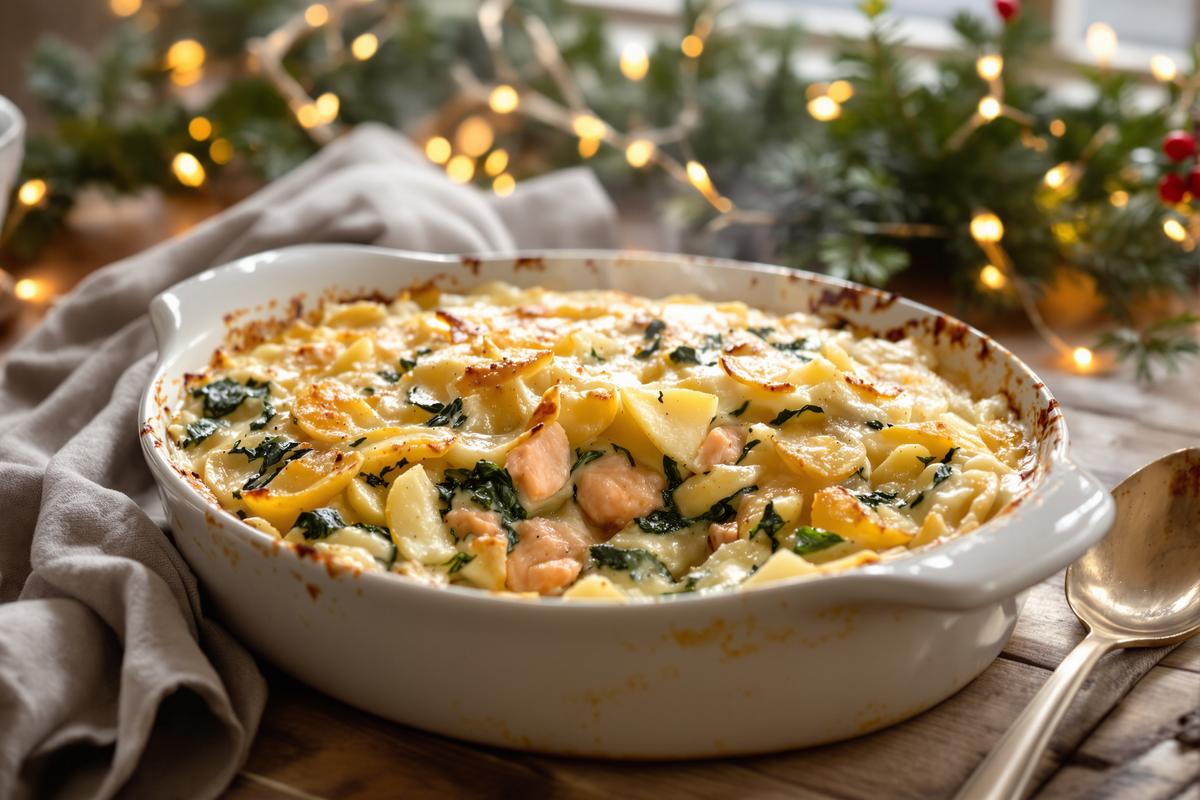 Ce gratin de saumon, épinards et pommes de terre est devenu un incontournable dans de nombreuses familles. S’il est parfait pour un repas de fêtes, il fonctionne aussi très bien en plein hiver, pour réchauffer les soirées.