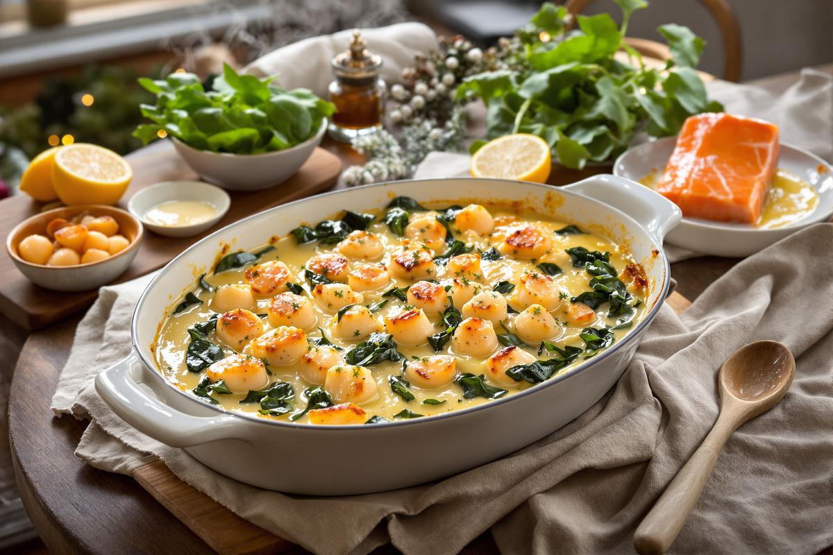 Le secret ? Un trio gagnant : saumon frais, Saint-Jacques moelleuses et épinards fondants, liés par une béchamel soyeuse légèrement citronnée. Une fois passé au four, le tout devient un gratin doré et savoureux qui séduit tous les palais.