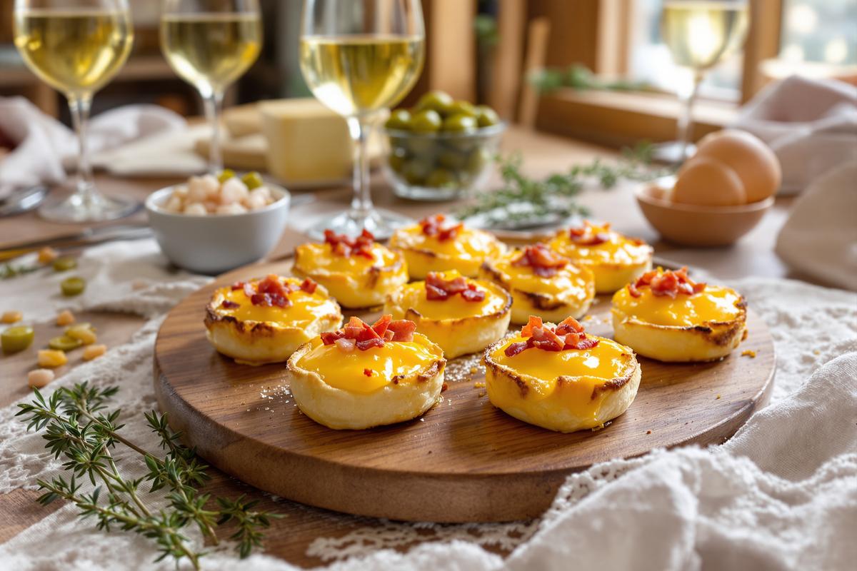 Ces bouchées, c’est toute l’âme de la raclette concentrée dans une seule bouchée. Une base feuilletée dorée, une garniture au fromage fondant, des lardons fumés et une pointe d’acidité grâce aux condiments.