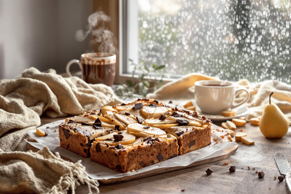 Ce gâteau poire-chocolat n’est pas qu’un simple carré sucré : c’est une parenthèse de douceur. Il ne cherche pas à épater mais à rassurer. Il se partage facilement, se prépare sans stress, et transforme un dimanche morose en instant cosy.