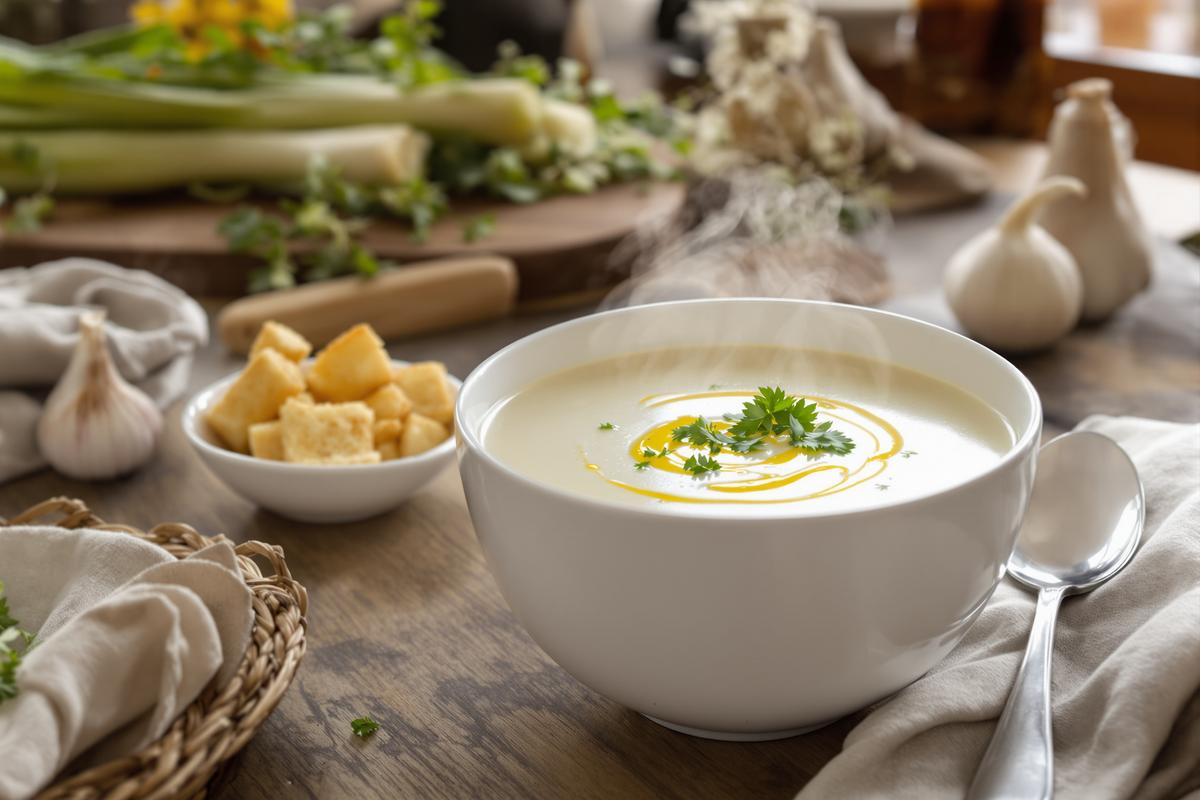 Envie d’une soupe douce, crémeuse, réconfortante… mais surtout pleine de goût ? Ce velouté blanc ultra fondant coche toutes les cases. Il se prépare avec des ingrédients simples du quotidien, mais sa saveur chaude et délicate, marquée par l’ail confit, surprend toujours agréablement. Une recette à la fois nourrissante, saine et parfaite pour les soirées d’automne ou d’hiver.